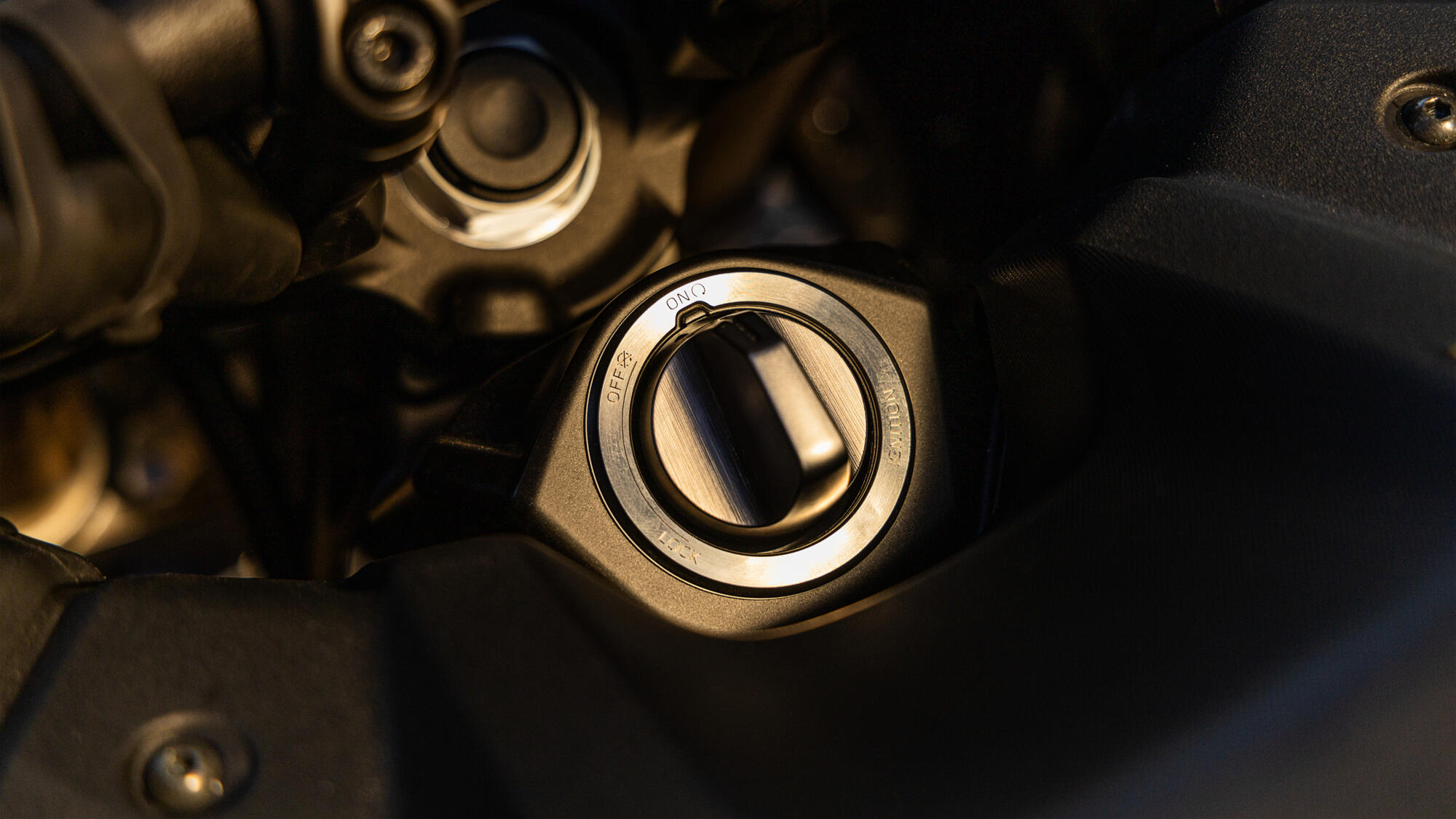 Systém Smart Key společnosti Yamaha umožňuje nastartovat TRACER 9 GT+ bez fyzického klíčku zapalování. Dálkový ovladač funguje v blízkosti motocyklu a umožňuje centrální zamykání a odemykání všech prvků, včetně zámku řízení, víčka palivové nádrže a standardních pevných bočních kufrů. Když je chytrý klíč mimo dosah, jsou všechny tyto prvky spolehlivě zabezpečeny. Stejným způsobem funguje i originální horní skříňka pro příslušenství Yamaha, pokud je namontována.