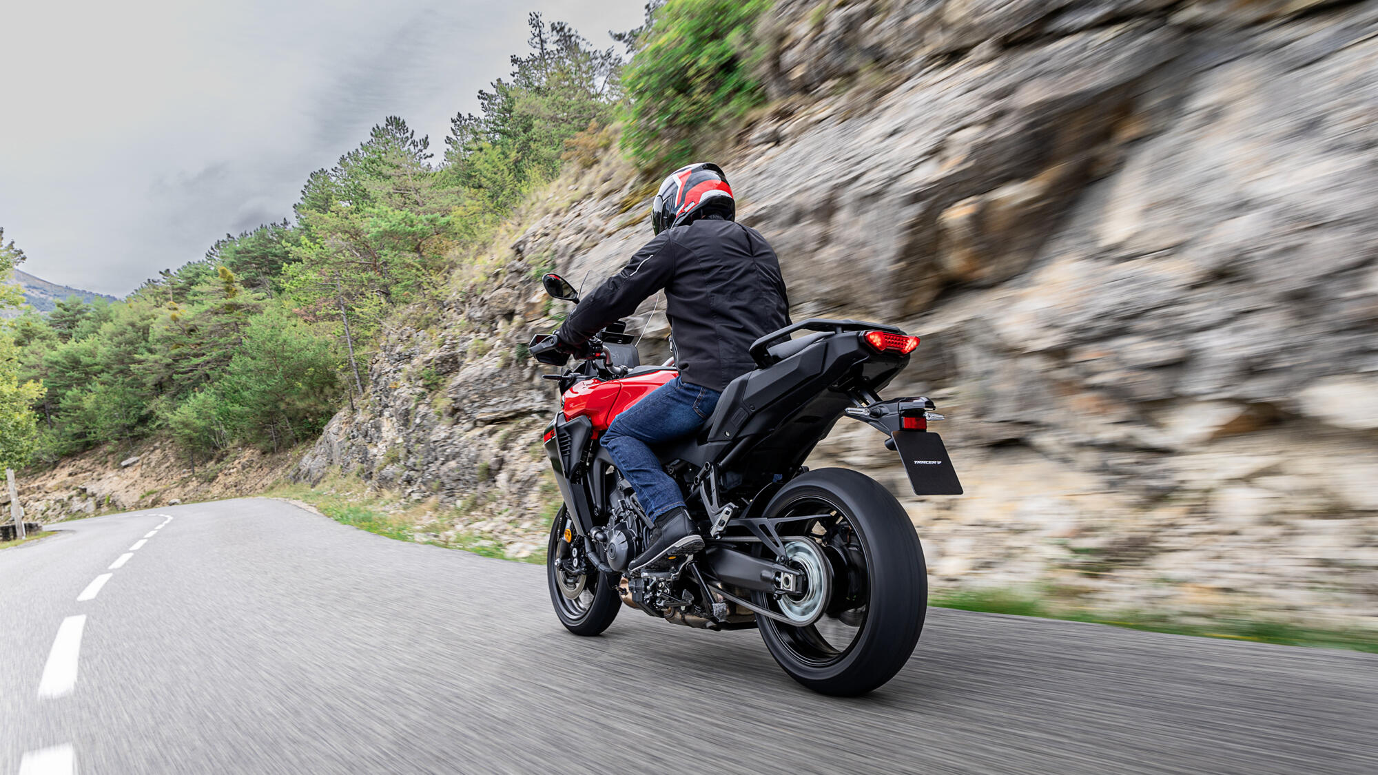 Nový 7″ TFT přístrojový panel má tři odlišná témata, od strohého uspořádání pro sportovní jízdu až po variantu plnou informací pro cestovní jízdu. Nový přepínač a pětisměrný joystick umožňují snadnou navigaci. Standardem je nabíjecí port USB-C a v pravé části kokpitu přibyl integrovaný úložný prostor.