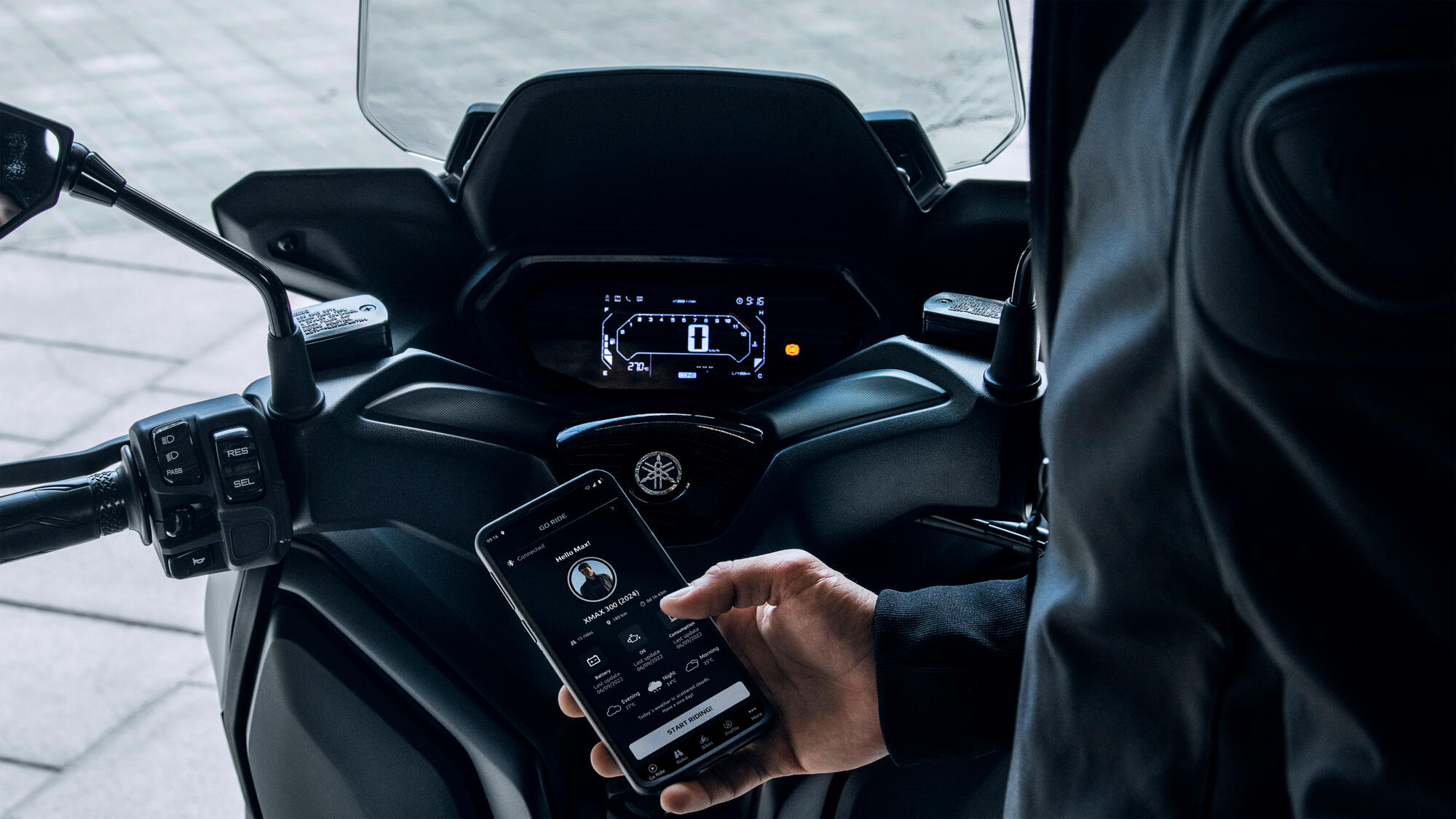 S XMAX 300 můžete zůstat v kontaktu s přáteli, rodinou i prací. Stačí si stáhnout bezplatnou aplikaci MyRide od společnosti Yamaha, propojit svůj chytrý telefon se skútrem přes Bluetooth® a můžete si zobrazit příchozí hovory a zprávy na 4,3palcovém LCD přístroji. Aplikace MyRide vám také umožňuje přístup k nejrůznějším informacím o chodu stroje a údajům o jízdě.