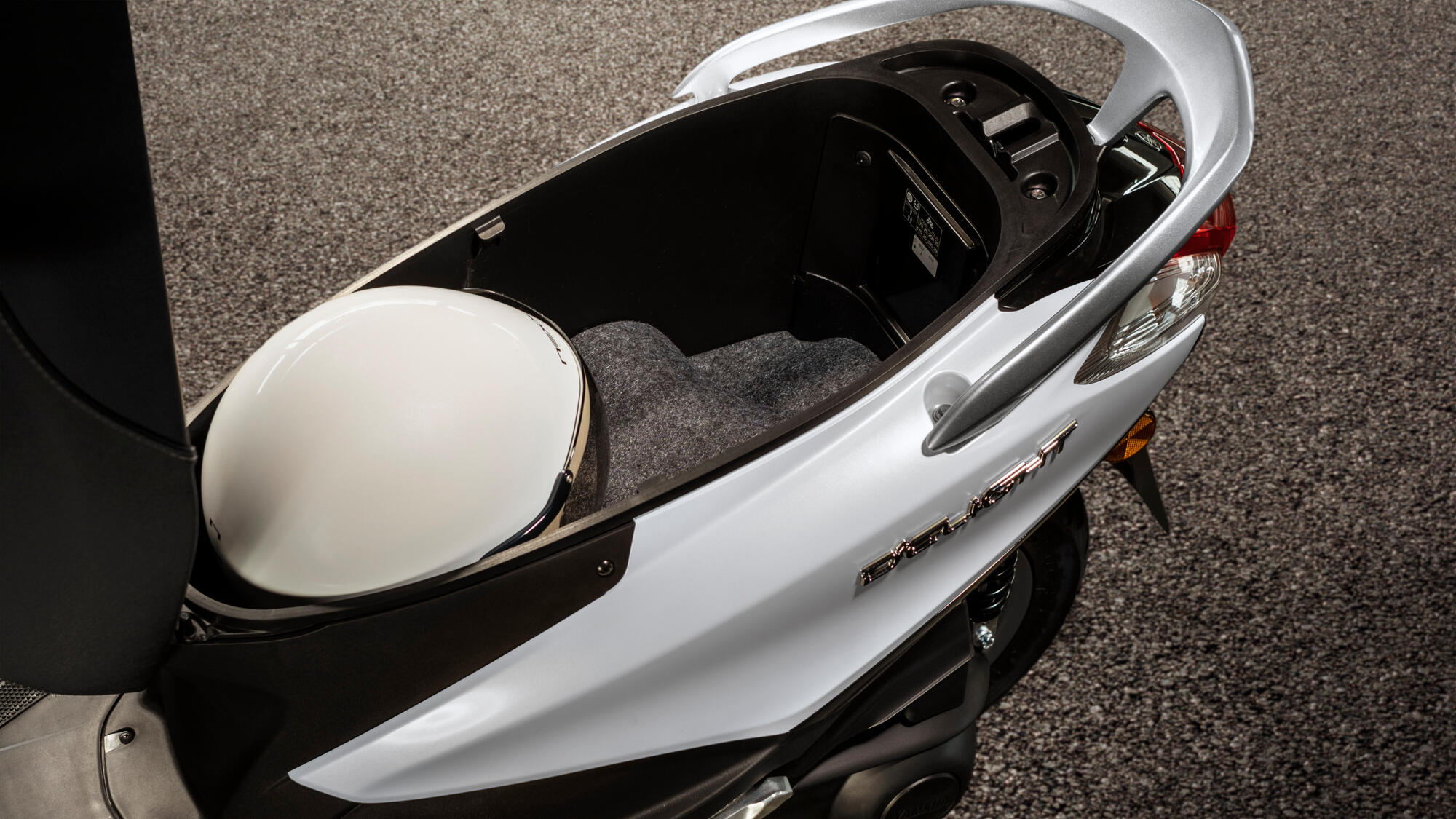 D’elight má pod sedadlem velký úložný prostor. Ve skutečnosti patří mezi málo skútrů své třídy, do něhož lze uložit integrální helmu. Když jste na cestě, je toto místo ideální pro umístění osobních věcí. Skútr navíc můžete využít, i když potřebujete vyrazit do obchodů a dokoupit si pár chybějících potravin.